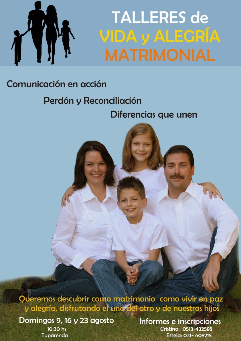 Estos talleres se realizarán los días 9, 16 y 23 de agosto. Está dirigido a todos los matrimonios que quieran descubrir como vivir en paz y alegría, disfrutando el uno del otro y de sus hijos.