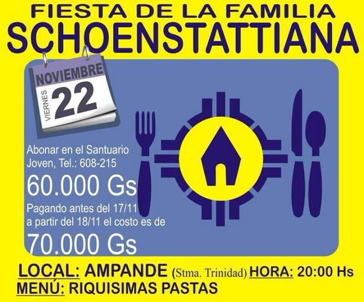 La rama familiar invita a la tradicional cena de fin de año de la gran Familia Schoenstattiana el viernes 22 de noviembre a partir de las 20:00 hs en el local de la AMPANDE.