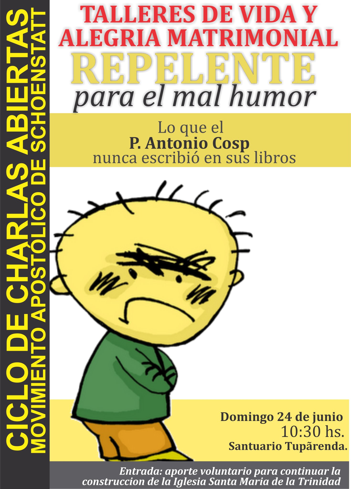 La Pastoral Familiar de Tupãrenda, dentro del ciclo de Talleres de Vida y alegría matrimonial, les invita a la charla abierta sobre el tema "Repelente para el mal Humor", este domingo 24 de junio a las 10:30 hs en Tuparenda.