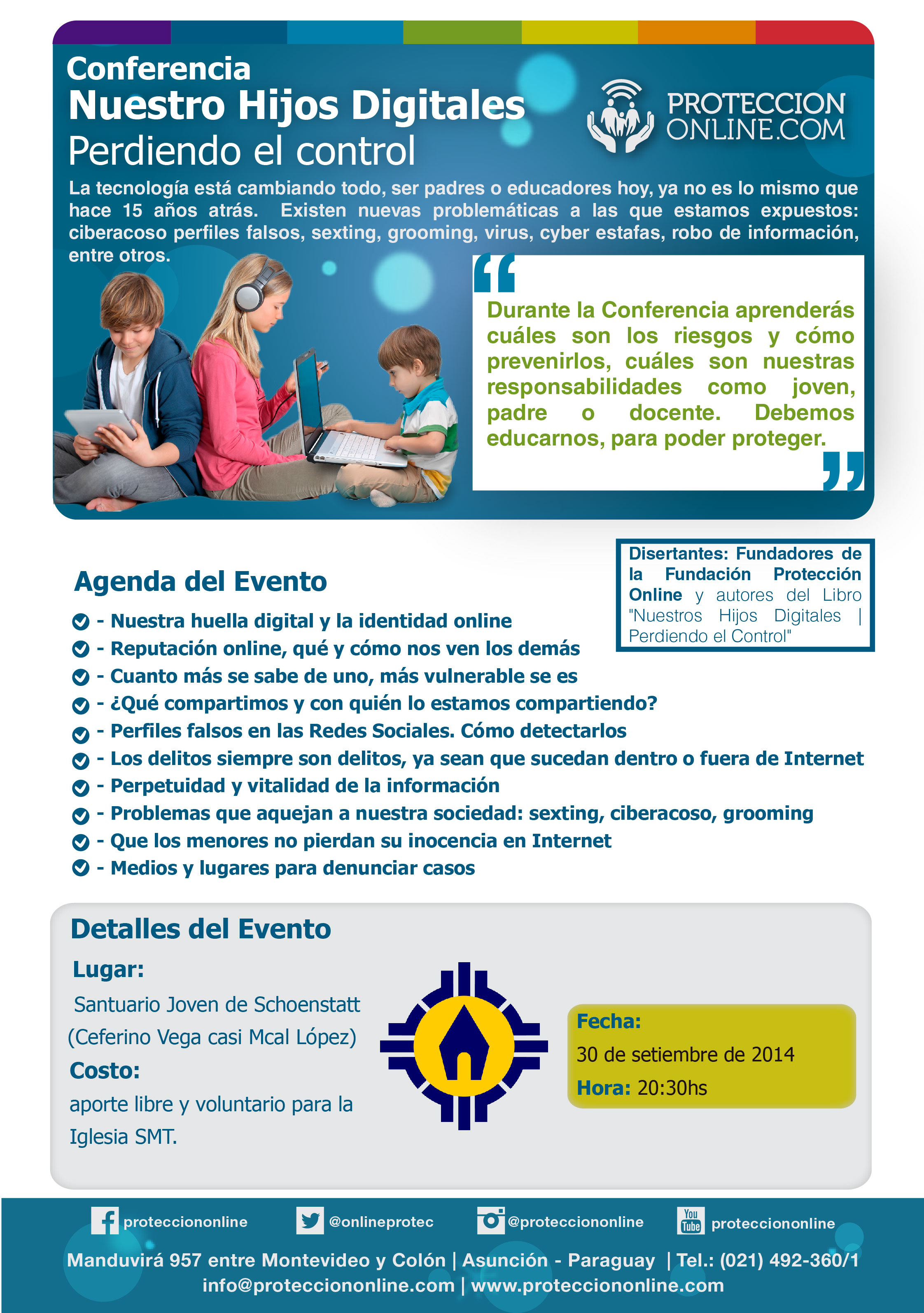 El Martes 30 de setiembre a las 20:30 hs en el Santuario joven, los Fundadores de la Fundacion "Proteccion Online" y los autores del Libro "Nuestros Hijos digitales, perdiendo el control", serán los disertantes de ésta conferencia con el mismo tema tan preocupante y actual, debemos estar informados y preparados por el bien de nuestros hijos.