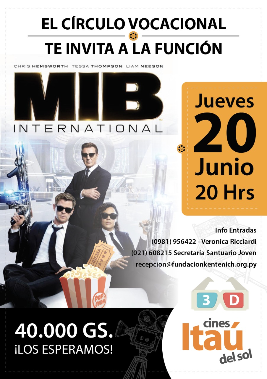 El Circulo Vocacional P. José Kentenich invita a la función de cine con la pelicula "Men in black", el proximo jueves 20 de junio a las 20:00 hs en la sala de cines del Shoping del Sol.