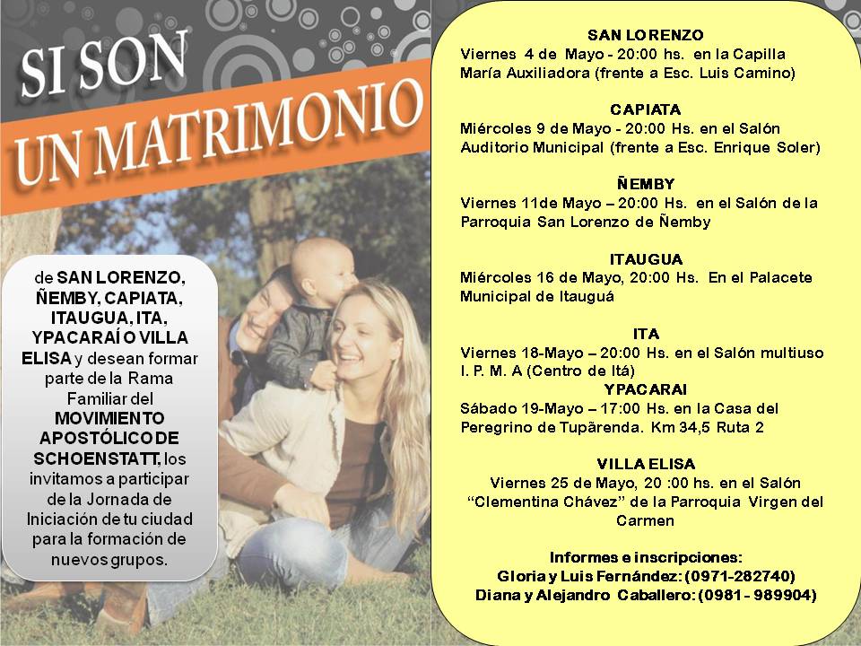 Invitamos a todos los matrimonios que quieran formar parte de nuestra gran familia de Schoensattt. La convocatoria esta hecha para el viernes 4 de mayo,a las 20hs, en la Capilla María Auxiliadora. El perfil del matrimonio invitado debe reunir las siguientes características: consagrado por la iglesia, deseoso de crecer como persona, como esposos y espiritualmente. Con actitud de servicio (apostolados) y predispuesto trabajar por el Reino de Dios de la mano de María.