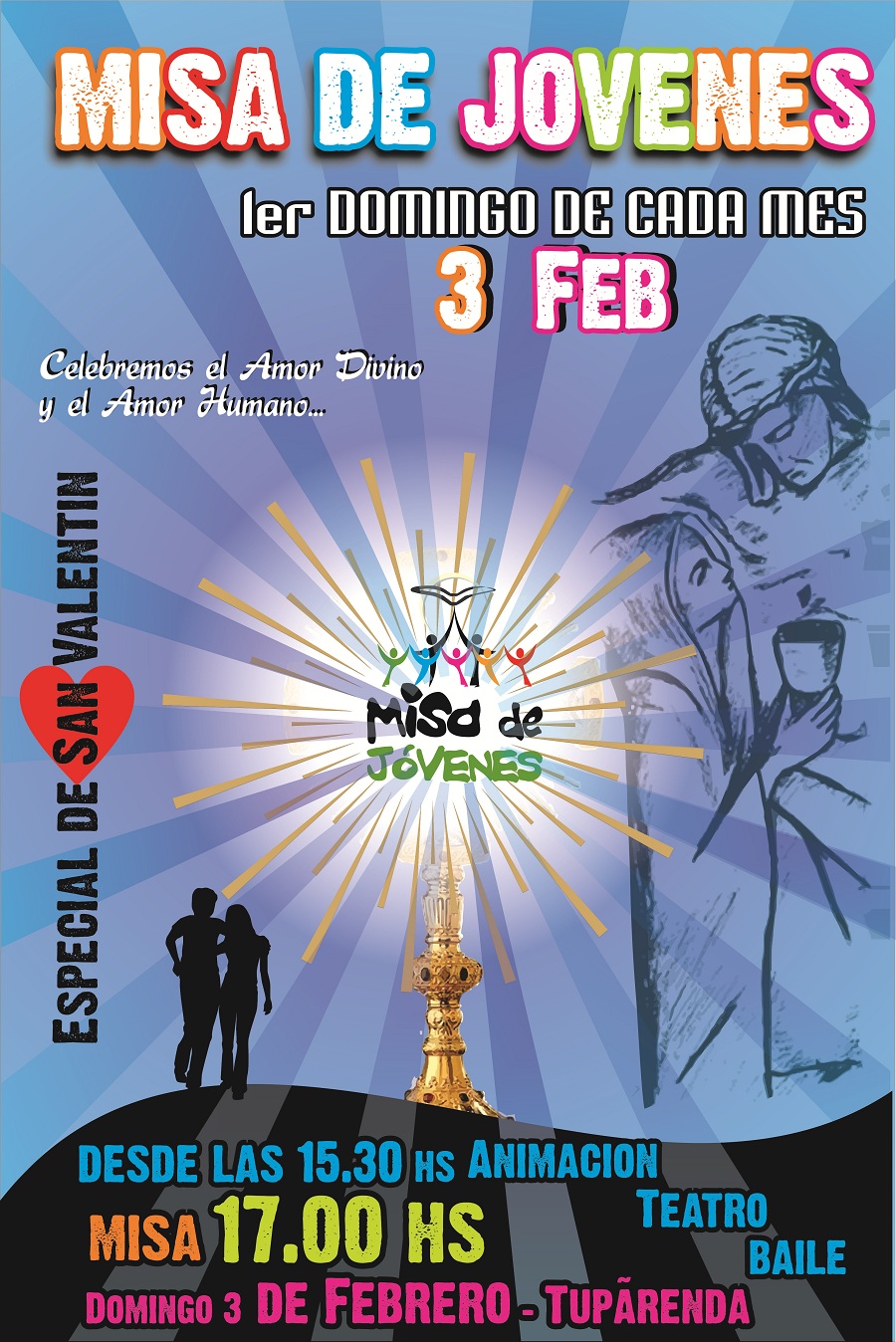 Que mejor manera de pasar un domingo con amig@s y por que no en familia, dándole un toque juvenil con bailes, cantos y alabanza a Dios. Les esperamos a todos este domingo 3 de febrero en el santuario de Tupãrenda. Desde las 15:30hs. Por supuesto, no dejaremos pasar la entrada al mes de los enamorados sin antes agradecer a Dios por tanto Amor. Y un cierre con la Santa Misa, a las 17hs. Todo esto, en el santuario de nuestra Mater. Los esperamos a todos!