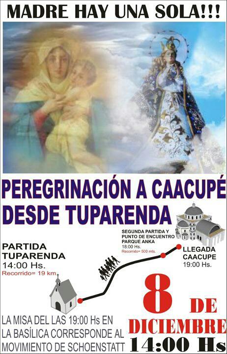 Les invitamos a participa de la tradicional peregrinación a Caacupé desde el santuario del Tupãrenda. Salida Nº 1 (Tupãrenda): 14:00hs. Salida Nº 2 (Parque Anka): 18:00hs. LLegada a las 19:00hs. para la misa que está a cargo del movimiento de Schoenstatt. Los esperamos a todos!!!