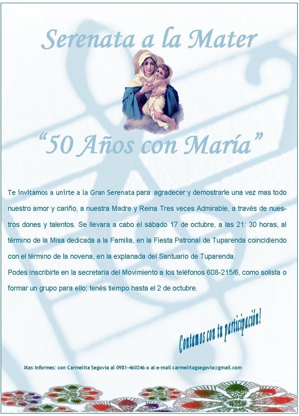 Te invitamos a unirte a la gran serenata para agradecer y demostrarle, una vez más, todo nuestro amor y cariño a nuestra Madre y Reina Tres Veces Admirable, a través de nuestros dones y talentos. La cita? el sábado 17 de octubre al término de la Misa dedicada a la Familia en la explanada del Santuario de Tuparenda.
