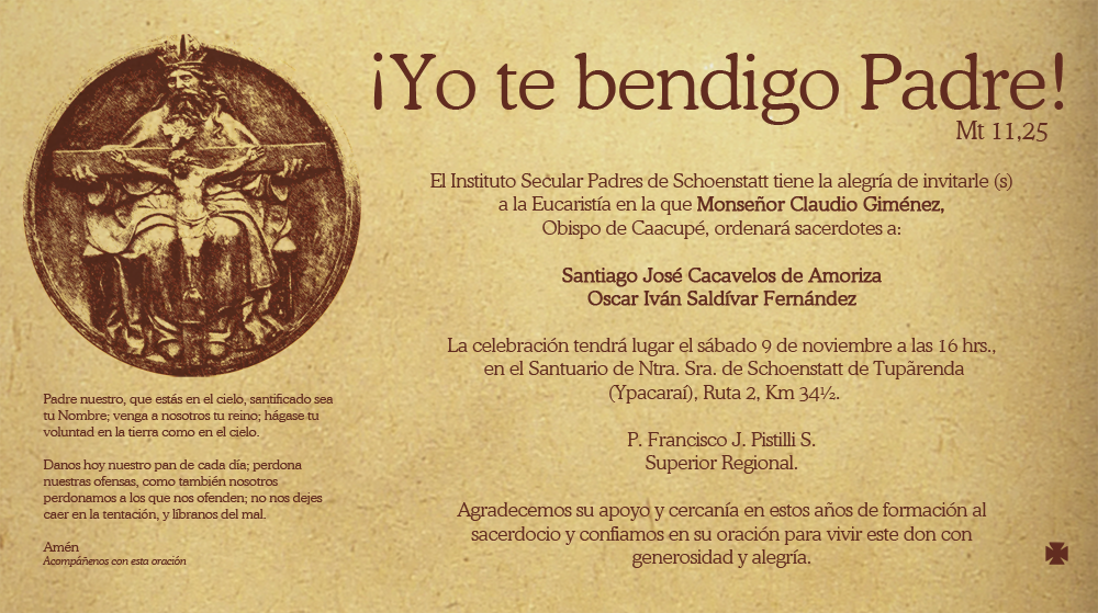 Estamos todos invitados a la ceremonia de ordenación sacerdotal de Santiago Cacavelos y Oscar Saldívar, el sábado 9 de noviembre a las 16:00 hs. en Tupãrenda.